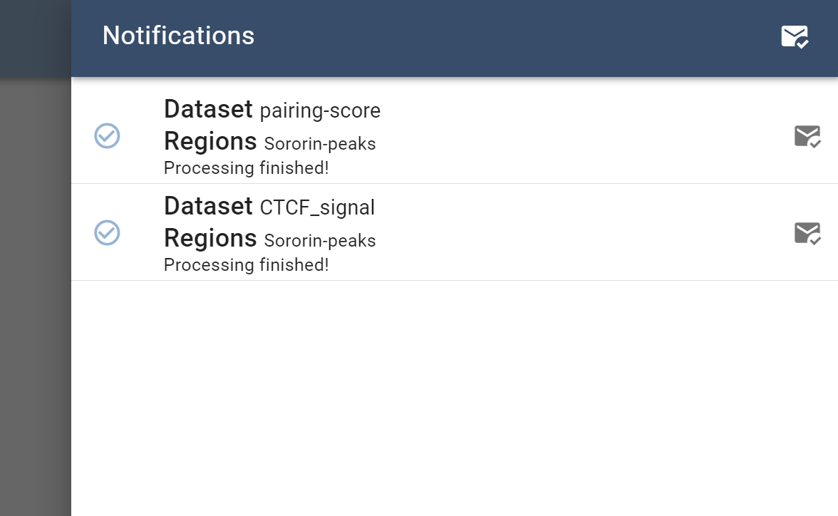 If you click on the notification symbol, a side-drawer opens, where you can see that features finished preprocessing for which genomic region set: