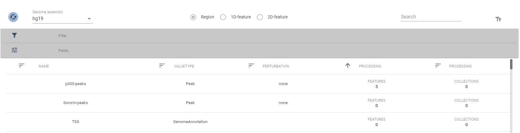 The fields Processing Features and Processing Collections indicate how many genomic features/feature collections are being processed for a given genomic region set.