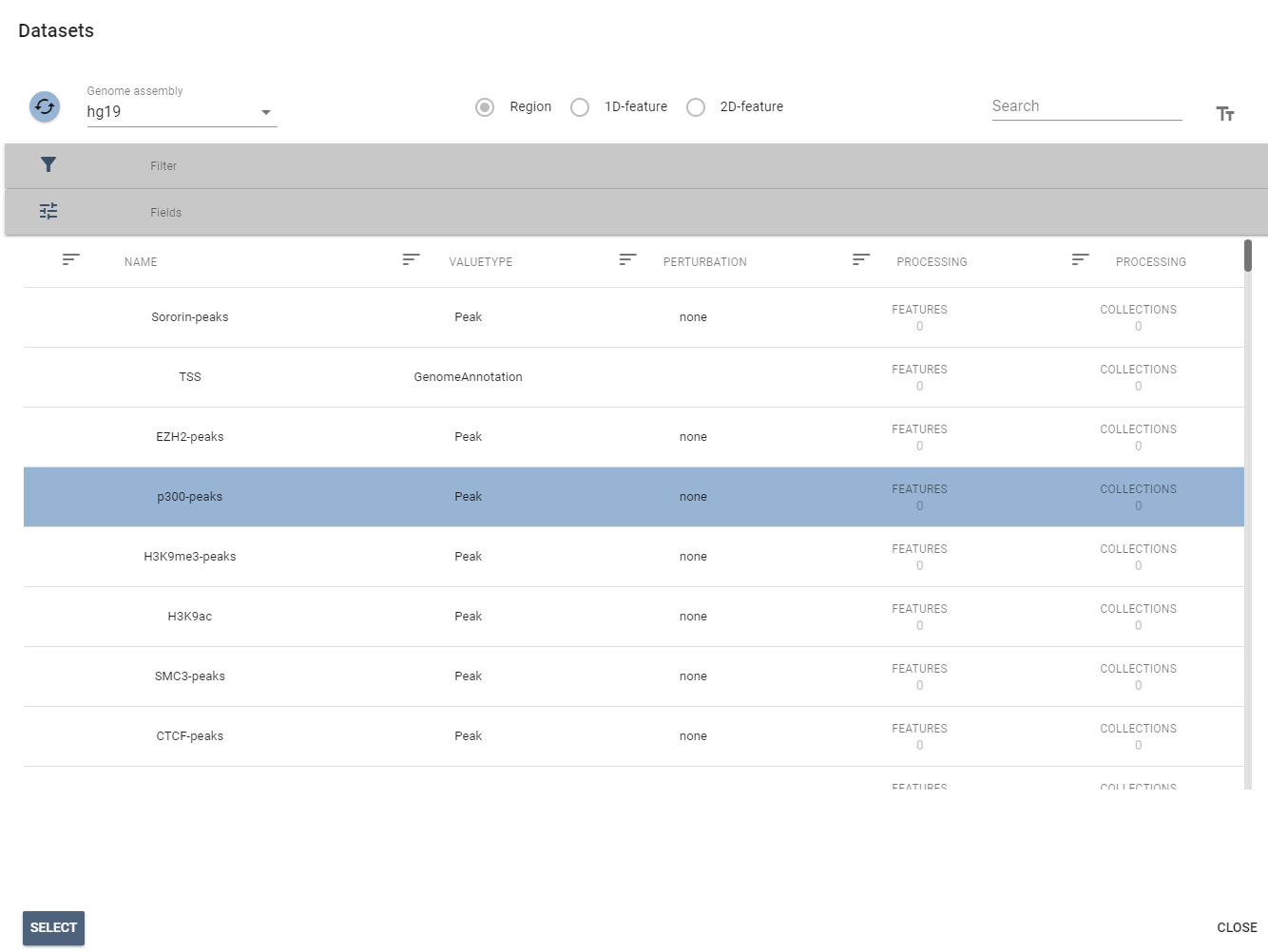 This will open up the dataset management table and allow you to select a genomic region: