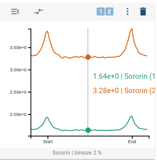 When an off-diagonal genomic region set (imported using BEDPE-files) is used, the widget will display icons (squared 1 and 2) for displaying left and right support data. These icons are not be displayed for 2d-feature heatmaps. Depending on the widget type, displaying left and right support may be mutually exclusive, and clicking the icons will toggle the displayed support.